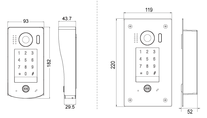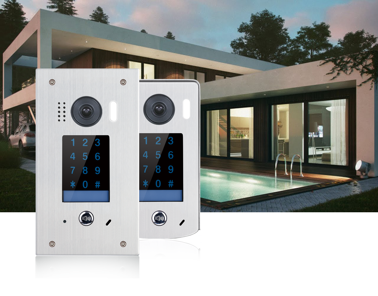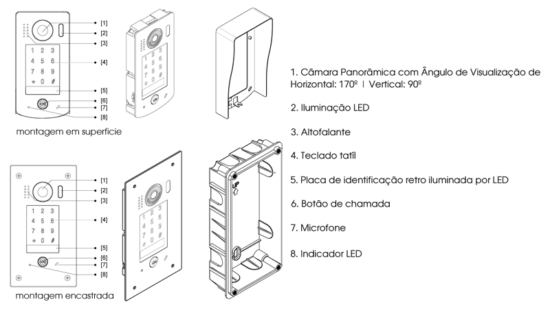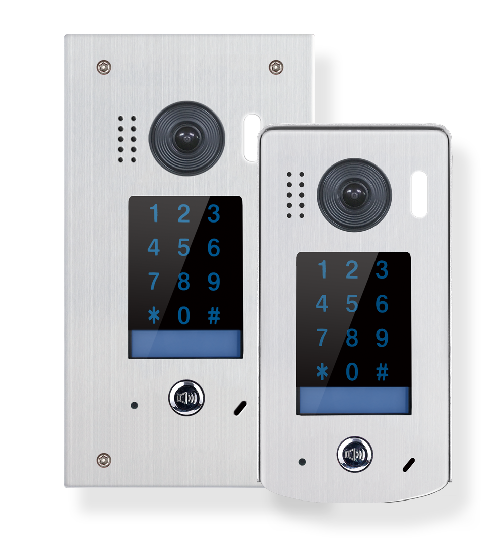 Sistema 2 fios, com câmara panorâmica e controlo de acessos integrado (PIN) com painel tátil